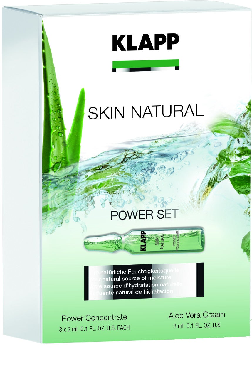 Klapp Skin Natural Power Set is een set voor alle huidtypen, vooral voor de gestreste en gevoelige huid. Aloë vera hydrateert en kalmeert de huid intensief. Droge plekken en roodheid worden verminderd en de teint ziet er fris en stralend uit. De set bevat: Power Concentrate (3 x 2 ml) en Aloe Vera Cream (3 ml).